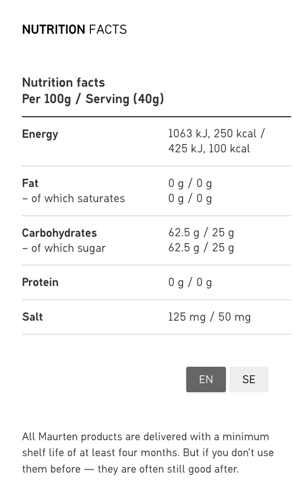 Energy encapsulated in a natural hydrogel. No added colorants, preservatives or flavours. 25g of carbohydrates per serving. Can be used before, during and/or after activity.